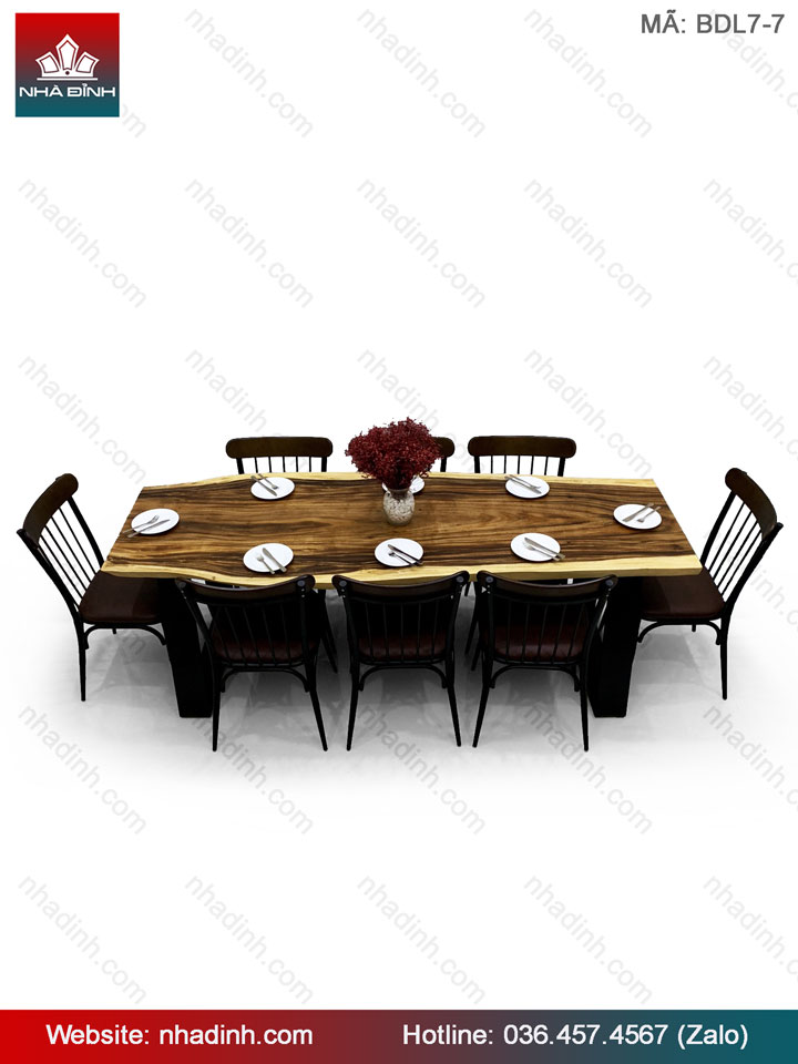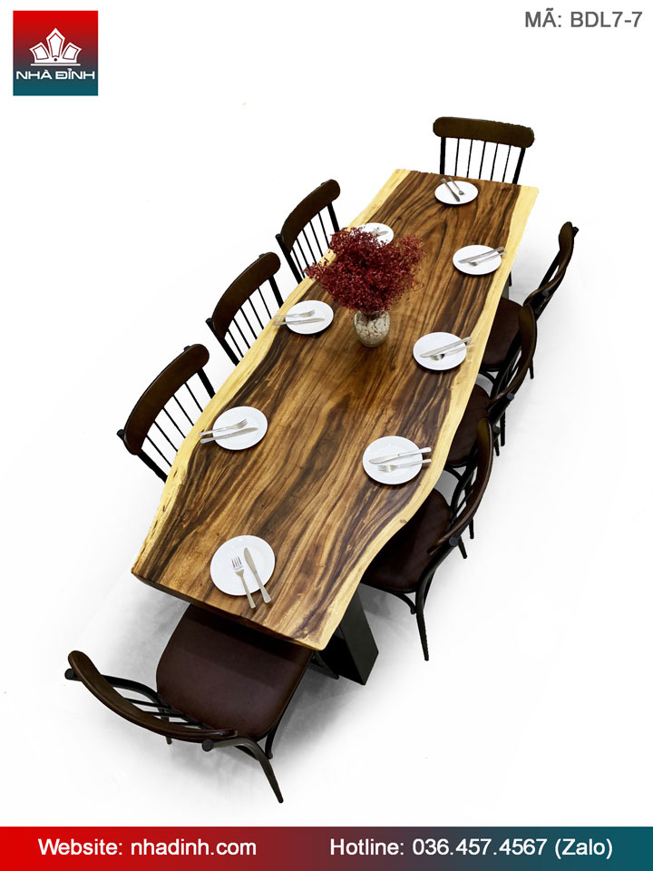 Bàn Ăn 8 Ghế Gỗ Me Tây Nguyên Khối Dài 214 Rộng 64,5-77-80 Dày 5 (cm)