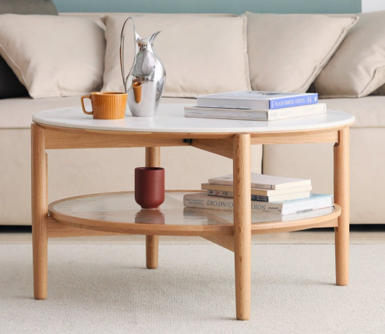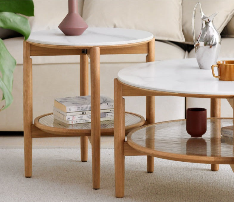 Bàn Trà Đôi Gỗ Sồi Kết Hợp Đá Và Kính Đường Kính 82-52 Cao 55 (cm)