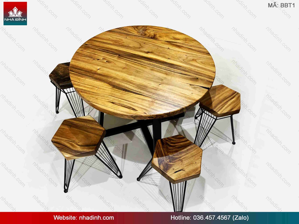 Bàn Tròn Gỗ Me Tây Mặt Ghép Và 6 Ghế Đẩu Đường Kính 100 Dày 5 (cm)