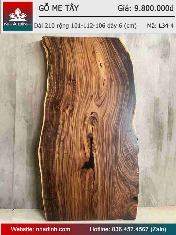 Mặt Bàn Gỗ Me Tây Nguyên Khối Dài 210 Rộng 101-112-106 Dày 6 (cm)