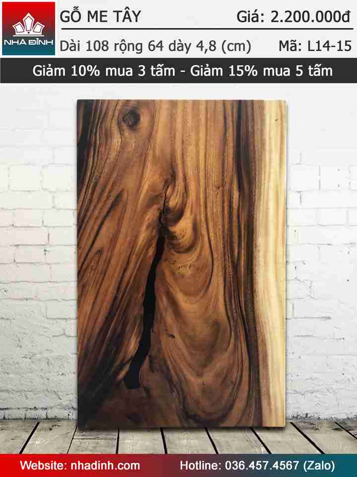 Mặt bàn gỗ Me Tây nguyên khối dài 1080 rộng 640 dày 48 (mm)