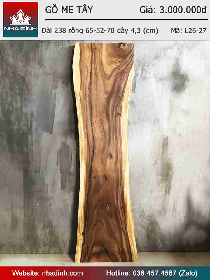 Mặt Bàn Gỗ Me Tây Nguyên Khối Dài 238 Rộng 65-52-70 Dày 4,3 (cm)