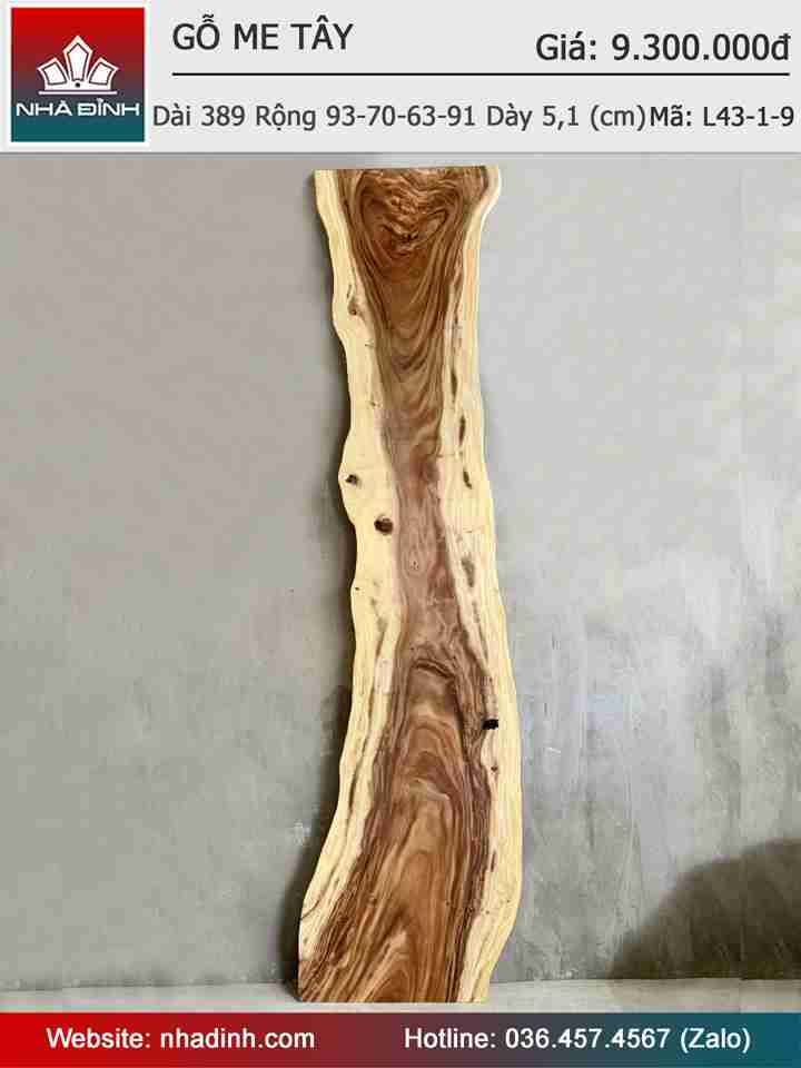 Mặt Bàn Gỗ Me Tây Nguyên Khối Dài 389 Rộng 93-70-63-91 Dày 5,1 (cm)