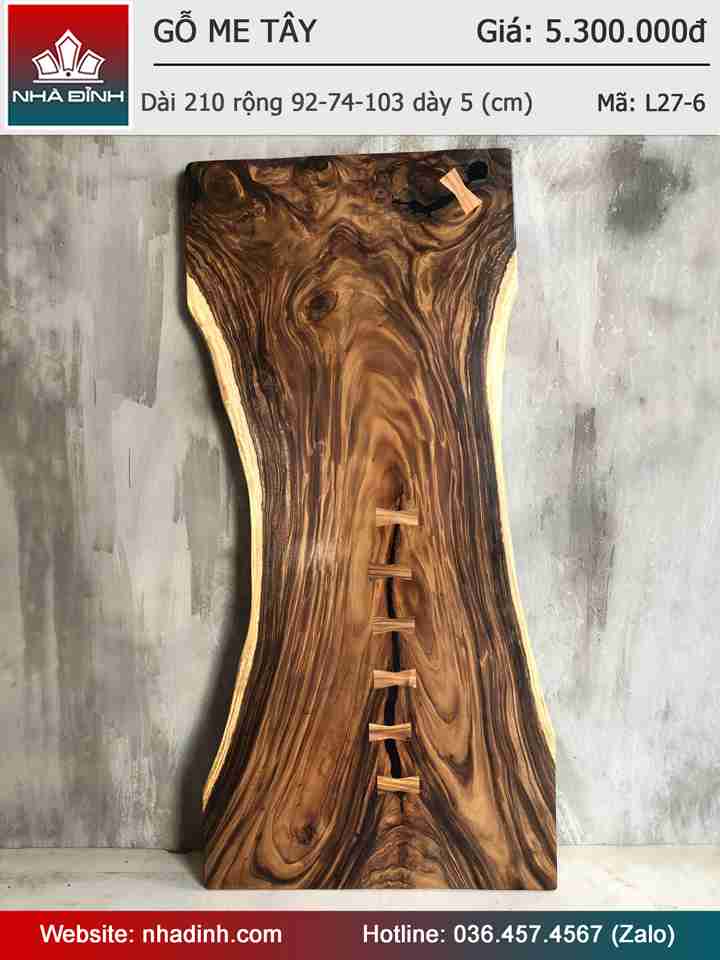 Mặt Bàn Gỗ Me Tây Nguyên Tấm Dài 210 Rộng 92-74-103 Dày 5( cm)
