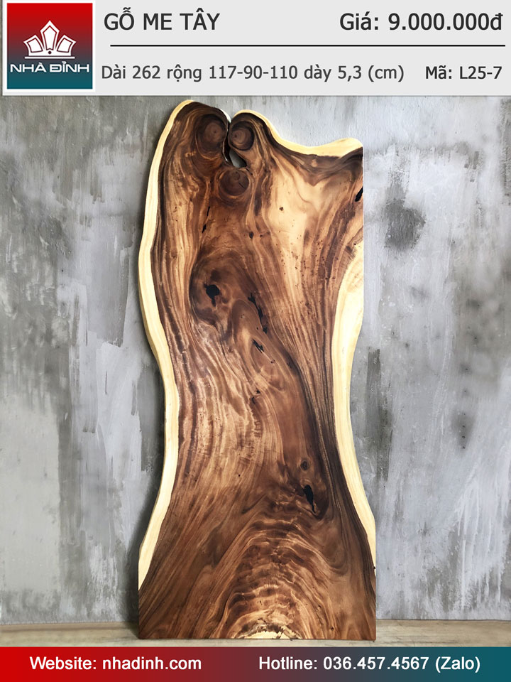 Mặt Bàn Họp Gỗ Me Tây Nguyên Khối Dài 262 Rộng 117-90-110 Dày 5,3 (cm)