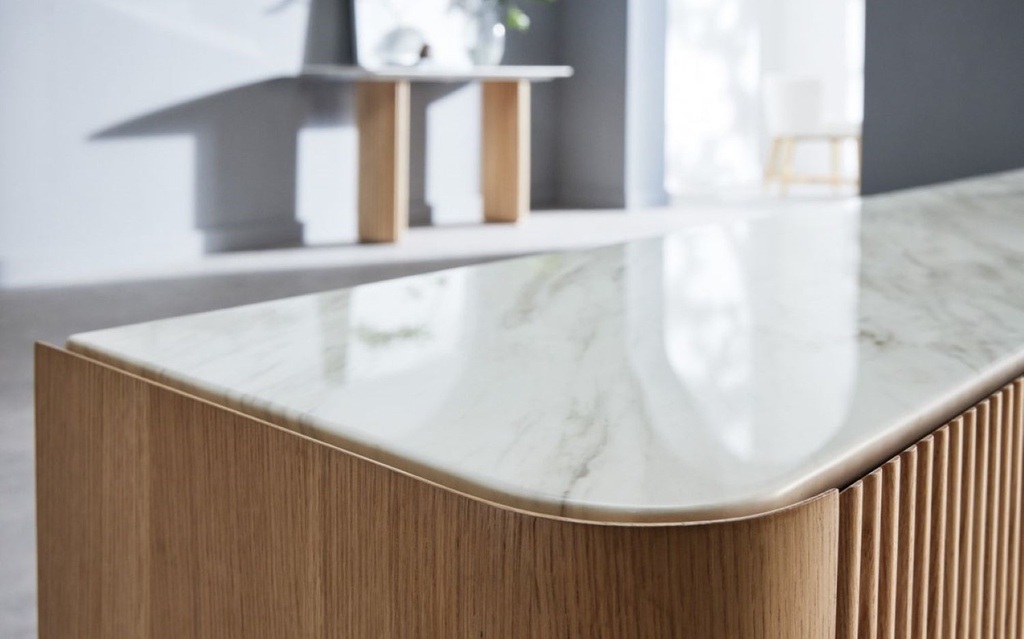 Chất liệu: Gỗ Sồi (Oak)_40% + Ván Cao Su Phủ Veneer Sồi_60% + Mặt Đá Trắng Moka