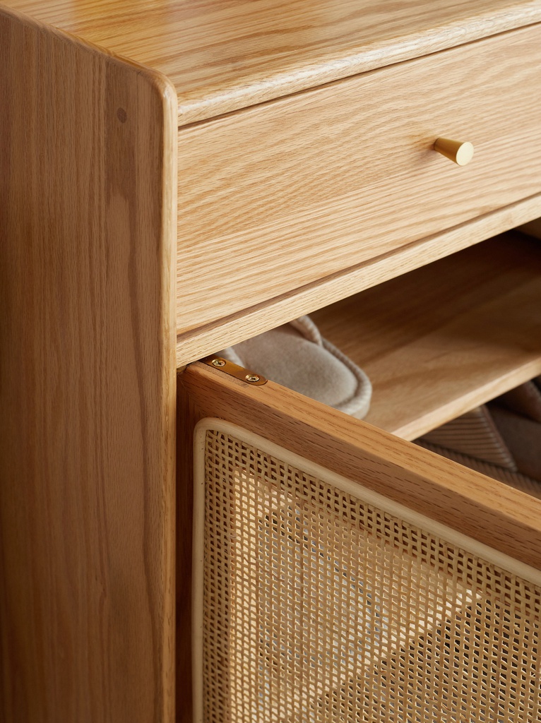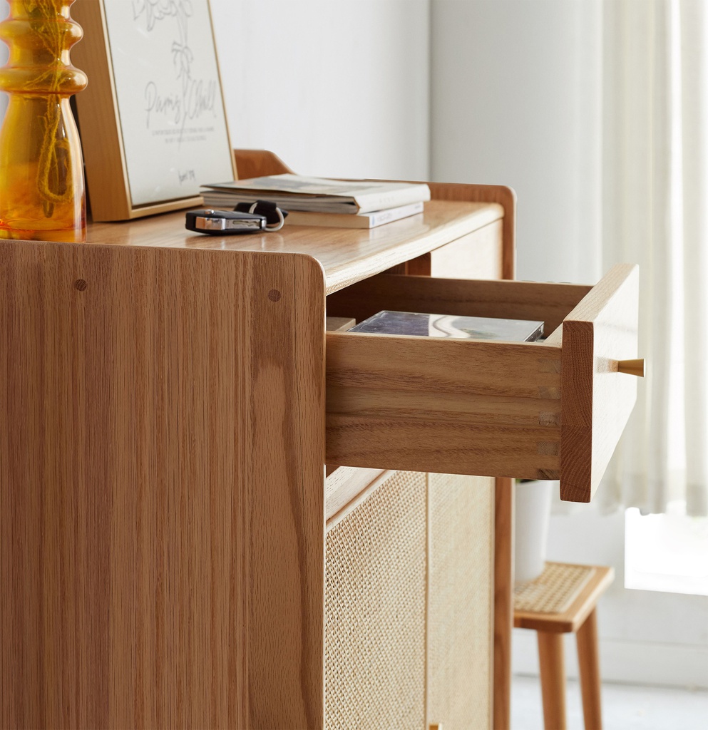 Chất liệu: Gỗ Sồi (Oak)_52% + Ván Cao Su Phủ Veneer Sồi_48% + Mây